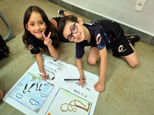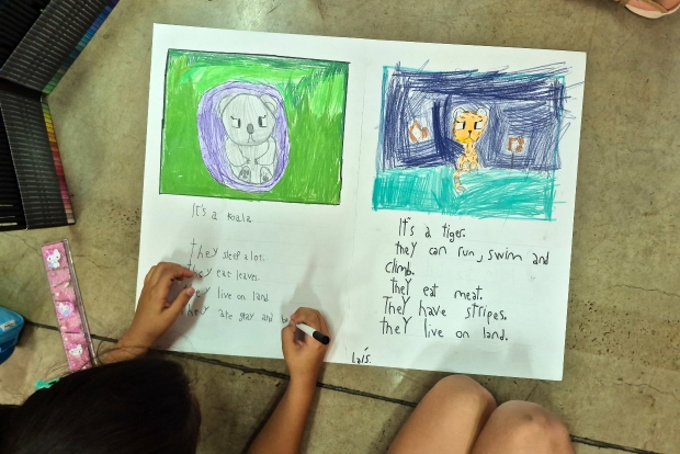 “A partir dos conhecimentos adquiridos, como habitat, alimentação e habilidades, os alunos confeccionaram, em duplas, um grande livro sobre os animais”, explicou a professora. O livro foi exposto no colégio, onde todos puderam conhecer mais sobre os animais e a Língua Inglesa.