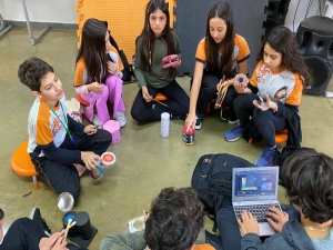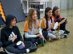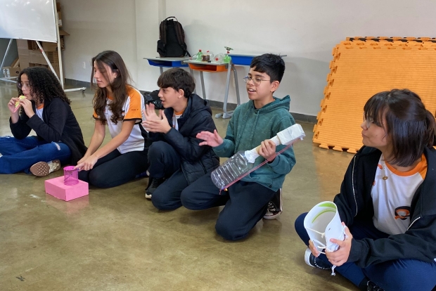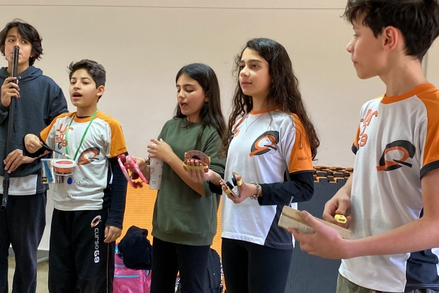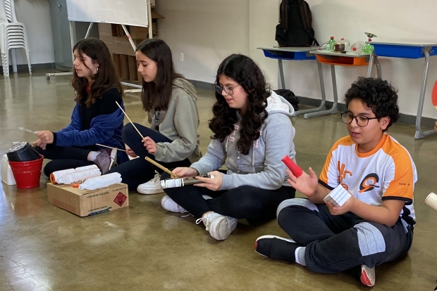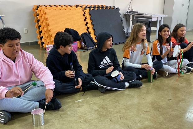 divididos em pequenos grupos para criarem um ritmo e, juntamente, cantarem uma