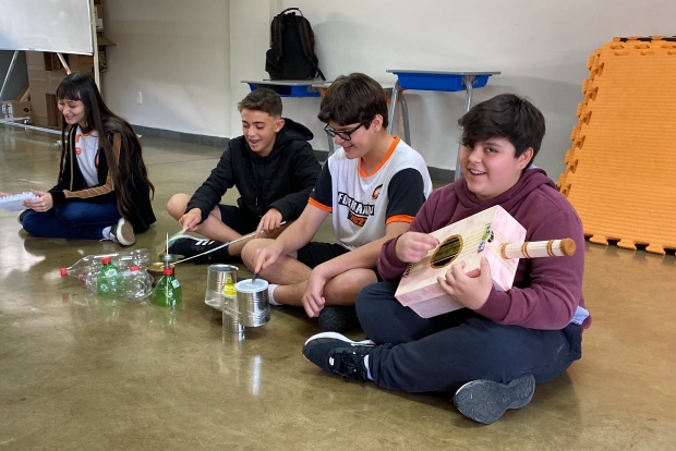 musicais com materiais, encontrados em casa, que seriam descartados.