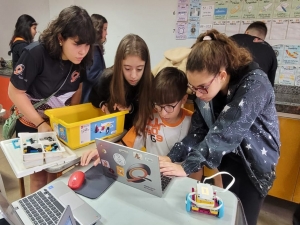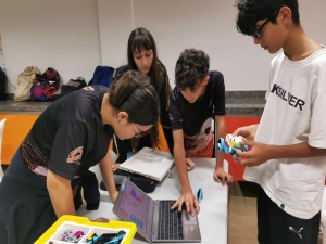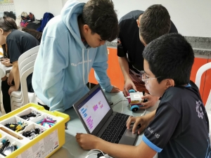 robôs Spike durante uma aula de robótica. Os desafios propostos envolveram a
