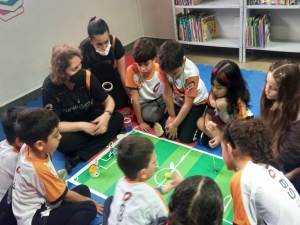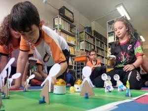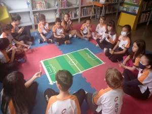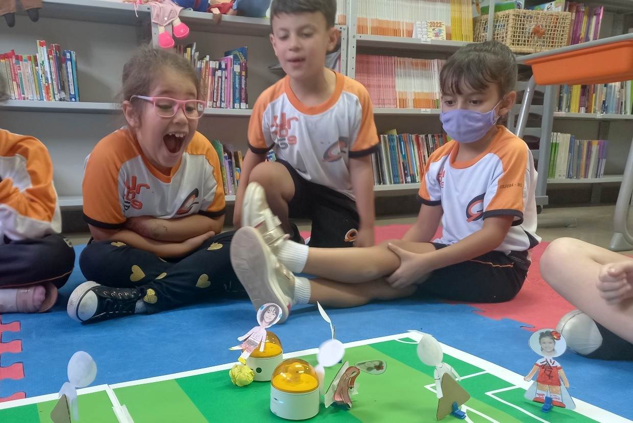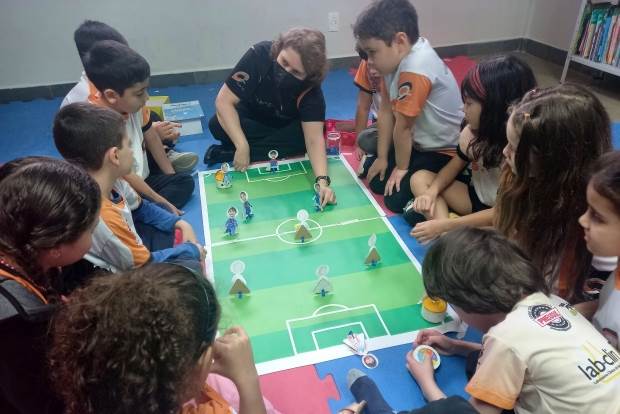 atividade com o robô MatataLab, que foi usado pelo alunos como “jogadores de