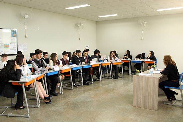 Alunos do 9º ano do Ensino Fundamental II e do 1º ano do Ensino Médio realizaram simulação do Conselho de Segurança da Organização das Nações Unidas (ONU) como forma de finalizar os trabalhos realizados em sala de aula. A atividade teve como objetivo desenvolver habilidades de oratória, além de proporcionar a discussão de assuntos importantes sobre o mundo.