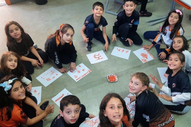 Logo depois, a turma aprendeu sobrem o urucum, semente que pode ser utilizado como alimento, remédio natural e também como tinta, sendo amplamente usado pelos povos indígenas para pinturas corporais, rituais e arte. Após o estudo, os alunos produziram tinta e criaram desenhos autorais, expressando suas ideias, cores e sentimentos a partir do que aprenderam.