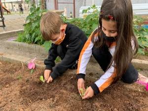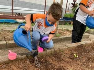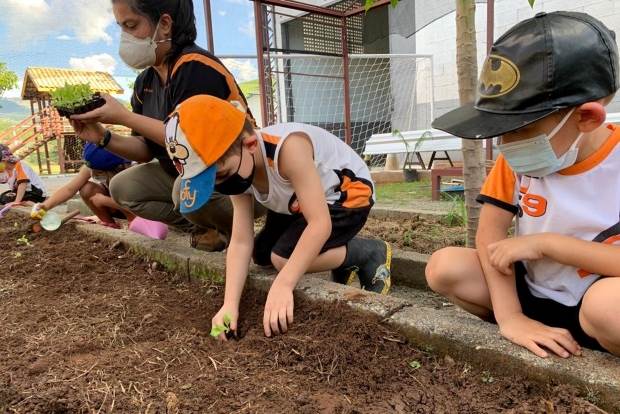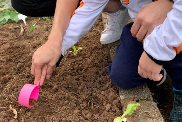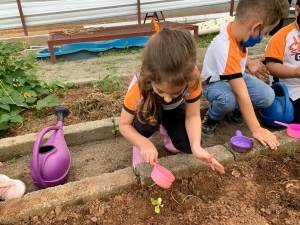 Os alunos do Jardim I (E41 e E42), das professoras Rejane e Letícia Benini, estiveram na horta pedagógica da escola para plantar mudinhas de alface e colher beterrabas.