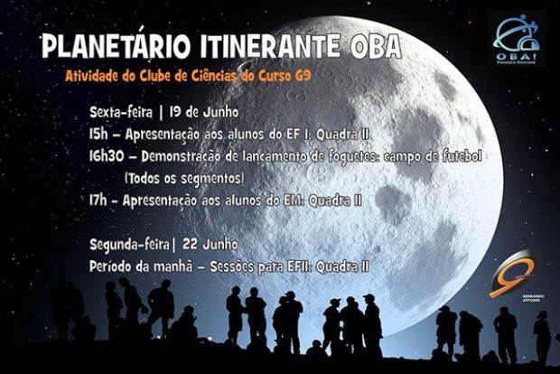 O Curso G9, em parceria com a Olimpíada Brasileira de Astronomia e Astronáutica (OBA), oportunizará a observação do céu noturno através de um planetário e demonstrações de lançamento de foguetes, em 19 e 22 de junho.